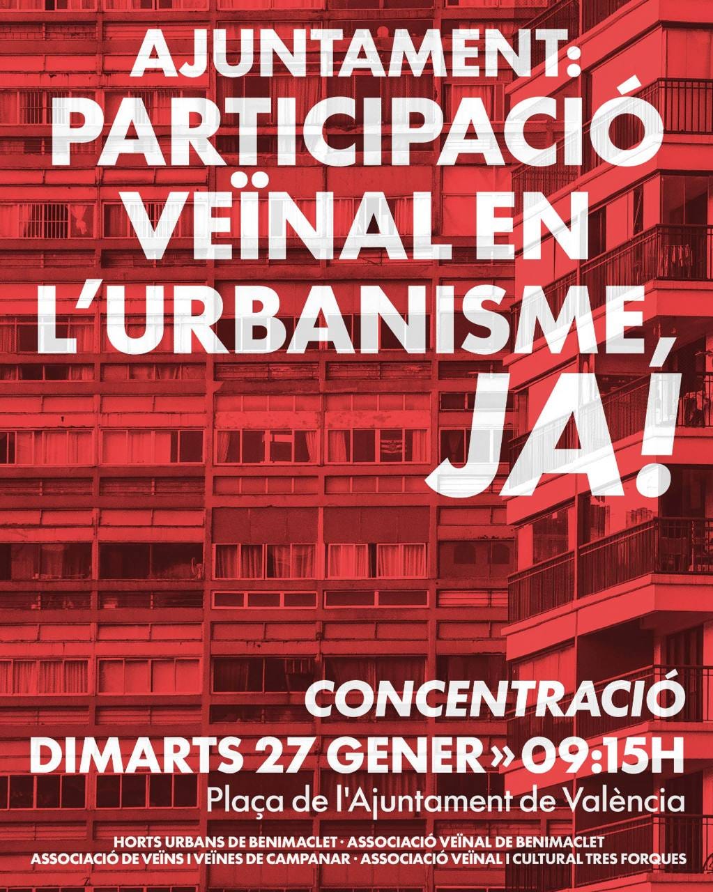 El pròxim dimarts 27 de gener a les 9:15h, coincidint amb el primer ple de l’Ajuntament de València, convidem el veïnat a manifestar-se a la plaça de l’ajuntament per donar visibilitat a les reivindicacions del barri de Campanar.