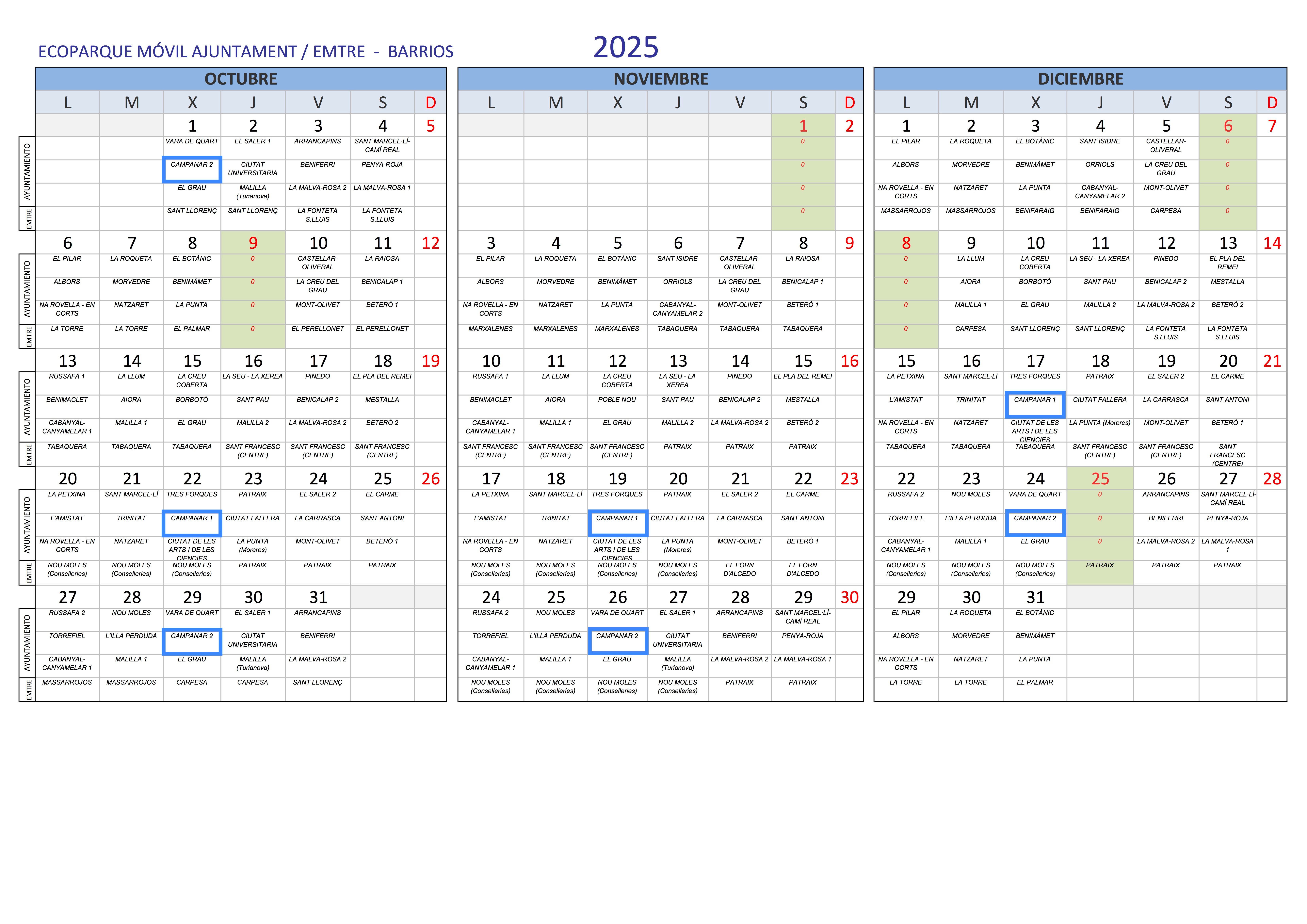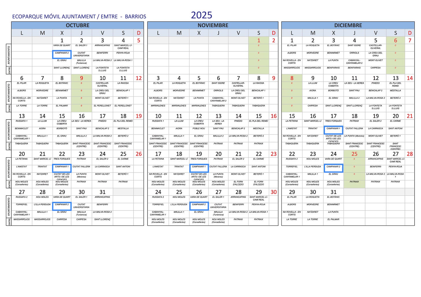 L’Entitat Metropolitana per al Tractament de Residus (EMTRE) estableix dos punts d’ecoparc mòbil a Campanar. A continuació us informem de les ubicacions i dels dies en els que estaran disponibles per als pròxims mesos fins que acabe l’any.