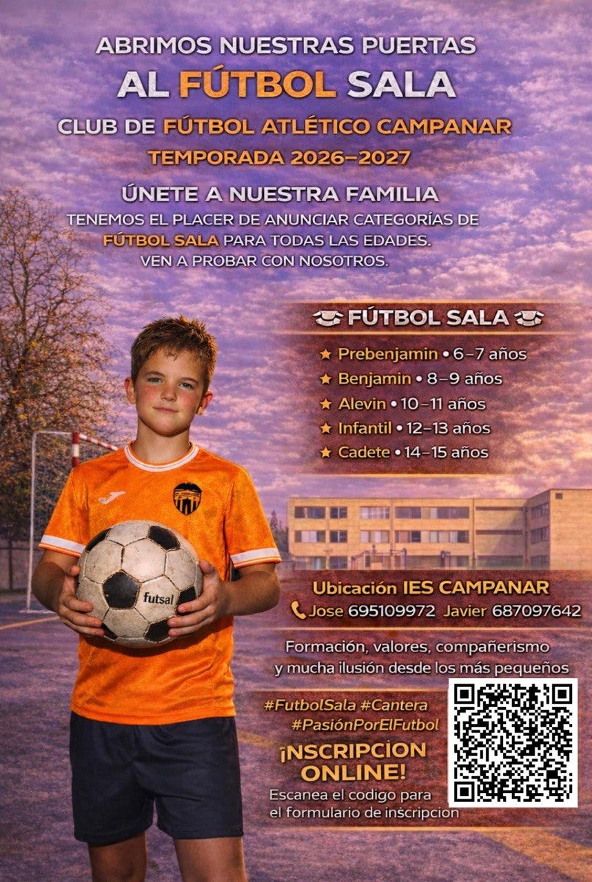 El Club de futbol Atlètic de Campanar ha obert inscripcions per a futbol sala. Les xiquetes i xiquets de 6 a 15 anys poden inscriure’s en les diferents categories.