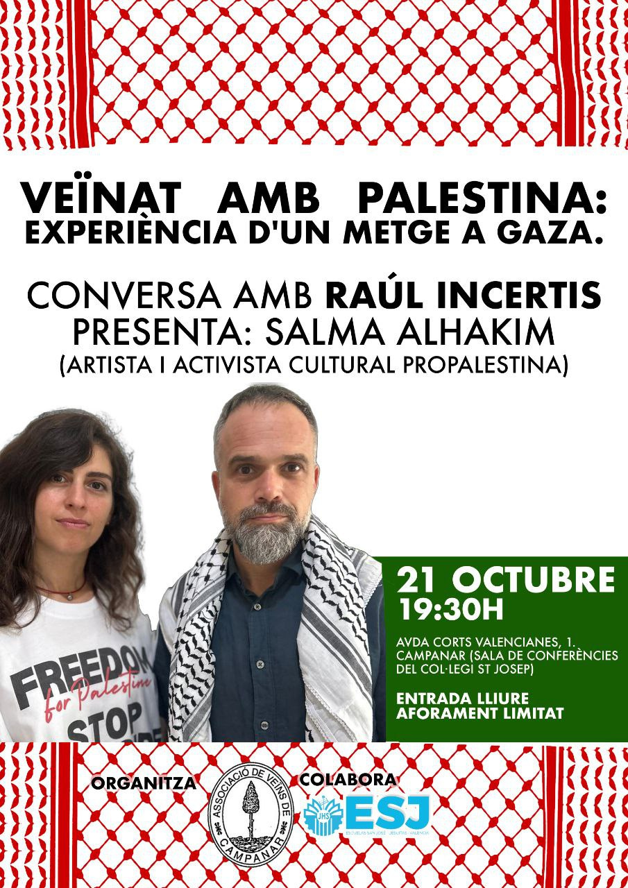 Hui dimarts, l’Associació de Veïns i Veïnes de Campanar organitza, amb la col·laboració del Col·legi Sant Josep, una conversa amb Raúl Incertis: “Veïnat amb Palestina: experiència d’un metge a Gaza”. La sessió la presentarà Salma Alhakim, artista i activista propalestina.