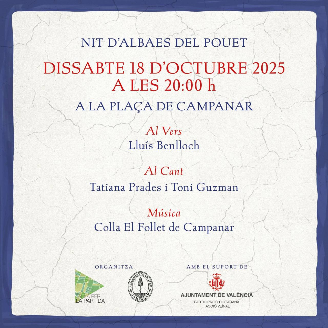 A la nit d’albaes participen al cant Tatiana Prades i Trini Carballo, al vers Lluís Benlloch, i a la música la Colla el Follet de Campanar.