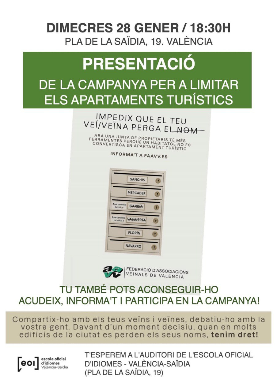 El pròxim dimecres 28 de gener a les 18:30h tindrà lloc la presentació de la campanya “Impedeix que el teu veí/veïna perda el nom” per a limitar els apartaments turístics.