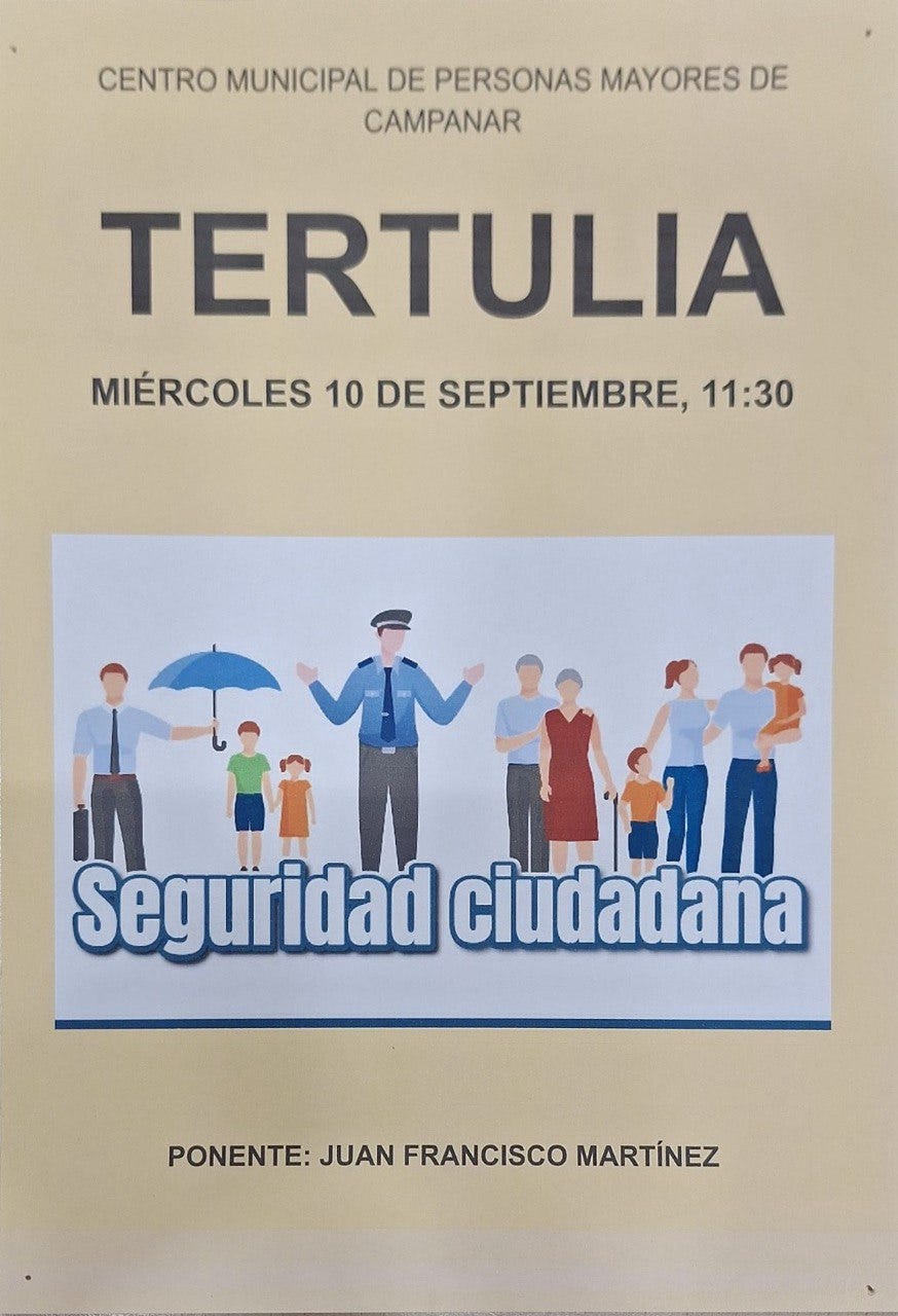 Tertúlia sobre seguretat ciutadana10 de setembre al Centre de Majors. 11:30hsep 09, 2025CompartirDemà dimecres 10 de setembre a les 11:30 tindrà lloc una tertúlia sobre seguretat ciutadana al Centre de Majors de Campanar.AnteriorSiguiente