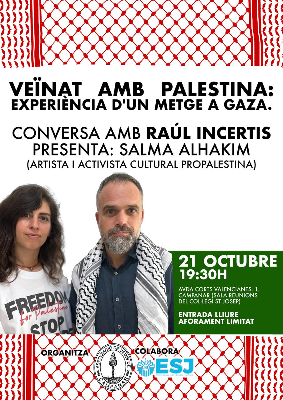 L’Associació de Veïns i Veïnes de Campanar organitza, amb la col·laboració del Col·legi Sant Josep, una conversa amb Raúl Incertis: “Veïnat amb Palestina: experiència d’un metge a Gaza”. La sessió la presentarà Salma Alhakim, artista i activista propalestina.