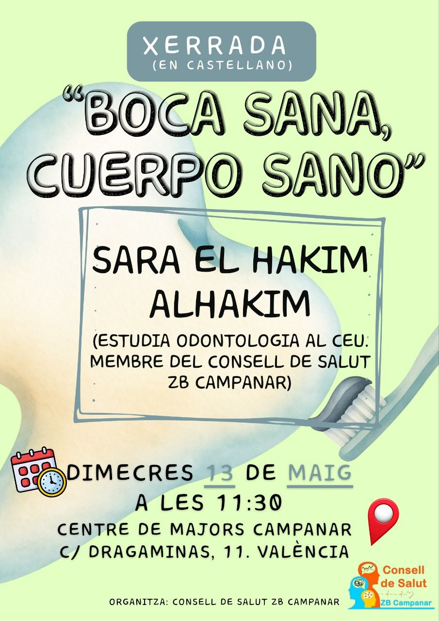 El Consell de Salut de Campanar organitza una xerrada sobre prevenció de la salut bucodental per a adults. La xerrada tindrà lloc el 13 de maig a les 11:30h al Centre de Majors de Campanar.